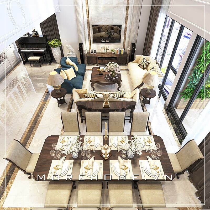 Thiết kế nội thất tân cổ điển đẹp với gỗ óc chó dành cho phòng khách liền phòng ăn trong căn hộ thông tầng như duplex, penthouse.