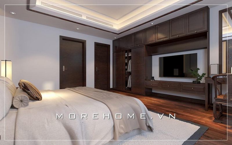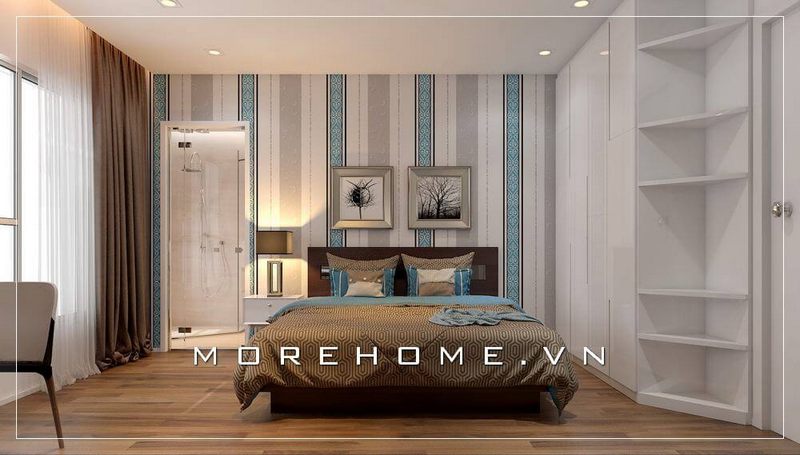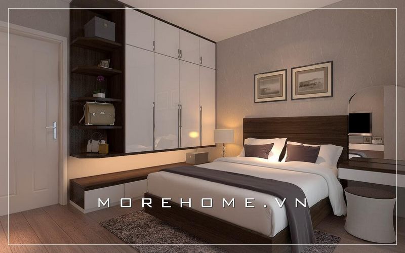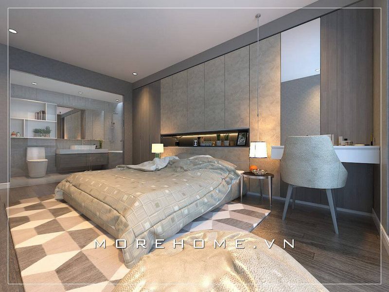 Bố trí nội thất phòng ngủ chung cư sang trọng, hợp lí, tủ quần áo âm tường kịch trần tạo cho không gian phòng ngủ thêm phần rộng thoáng hơn