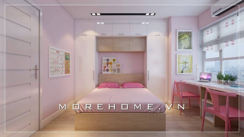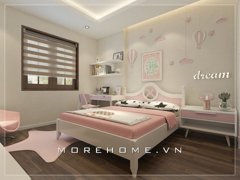 Bố trí nội thất phòng ngủ con gái phong cách hiện đại, trẻ trung, bàn làm việc bố trí ngay cạnh giường tạo cho con có không gian nghỉ ngơi, học tập thoải mái nhất