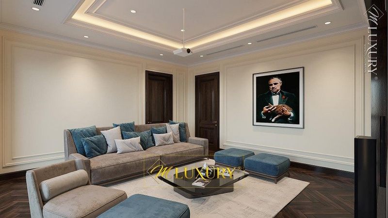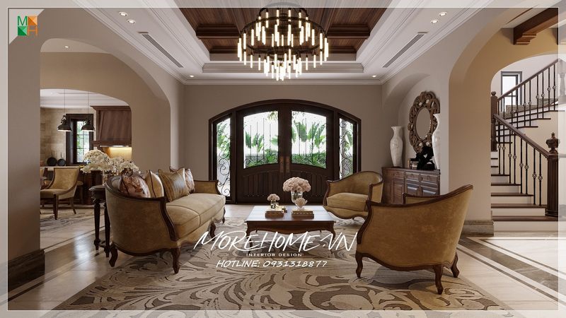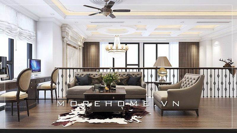 Mẫu thiết kế nội thất phòng khách nhỏ cho biệt thự ở tầng 2 với bộ sofa tân cổ điển đẹp tạo không gian thư giãn và đón khách lí tưởng