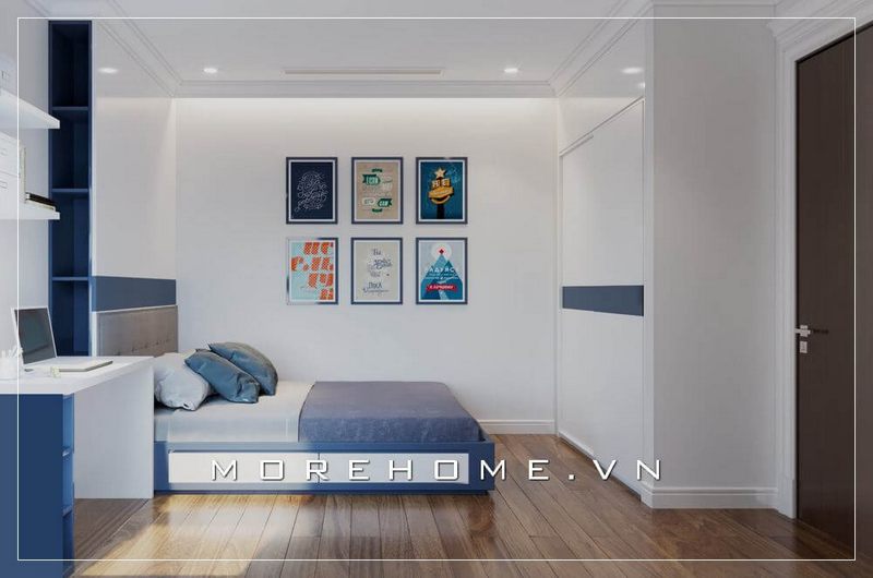 Mẫu giường ngủ màu trắng gỗ công nghiệp với sự kết hợp giữa 2 gam màu trắng - xanh tao nét độc đáo và cá tính cho căn phòng