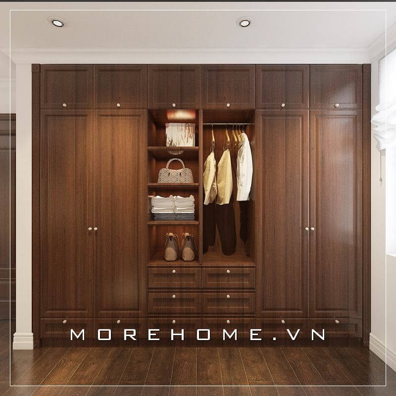 Tủ quần áo gỗ màu nâu với cánh mở tiện dụng, thiết kế nhiều ngăn phù hợp cho việc cất giữ đồ đạc khác nhau như: quần áo, túi xách...