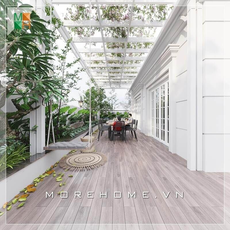 Ngoài sân vườn của thiết kế biệt thự cao cấp bố trí cả xích đu, bàn ăn lớn,... phục vụ mọi nhu cầu của các thành viên trong gia đình.