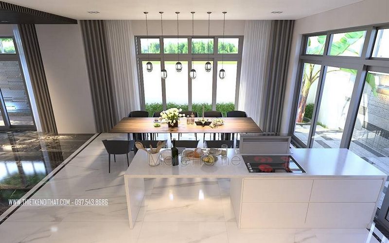 Hiện nay việc bố trí phòng ăn biệt thự, nhà phố không gian mở rất được ưa chuộng, giúp cho không gian phòng được mở rộng thoáng đãng hơn và những bữa ăn sẽ trở nên vui vẻ, hứng khởi hơn nhờ nguồn năng lượng từ ánh sáng thiên nhiên.