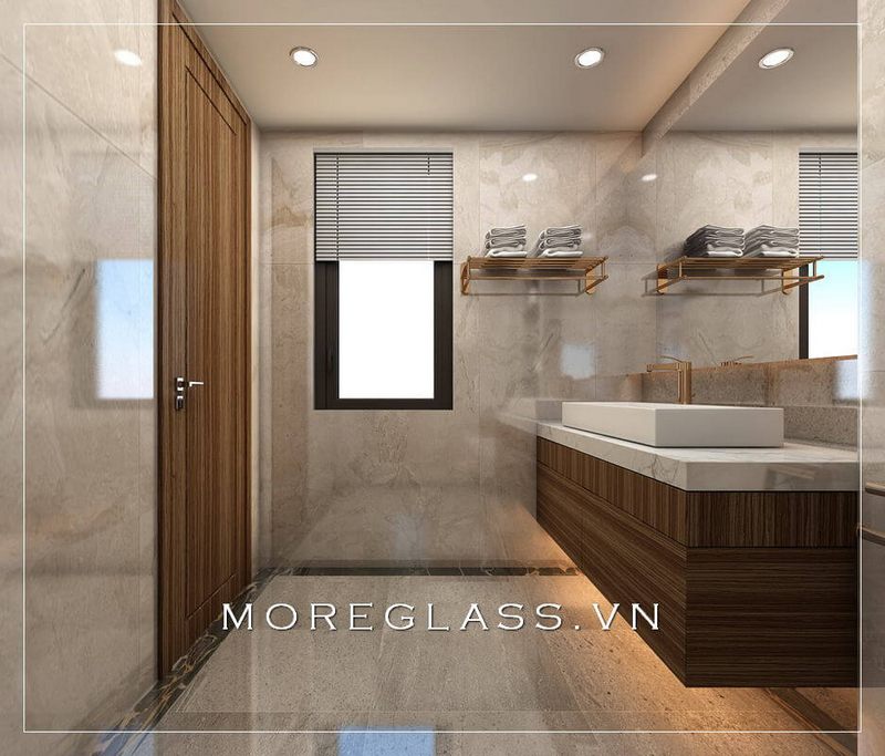Cửa kính phòng tắm hiện đại, sử dụng kính cường lực cao cấp giúp phân chia hai khu tắm và tủ kệ lavabo mang vẻ đẹp sang trọng, lôi cuốn.