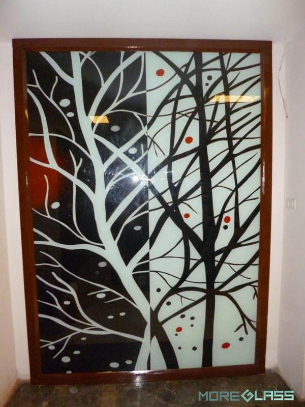 Mẫu thiết kế vách kính ốp tường khung gỗ in nghệ thuật trừu tượng thể hiện sự đối lập giữa ngày và đêm phù hợp chung cư, nhà phố, biệt thự phong cách hiện đại
