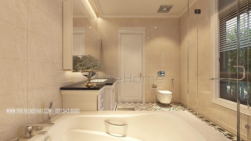 Phòng tắm nhà phố trang trí với tông màu sáng phong cách tân cổ điển nội thất đáp ứng nhu cầu sử dụng của gia chủ.