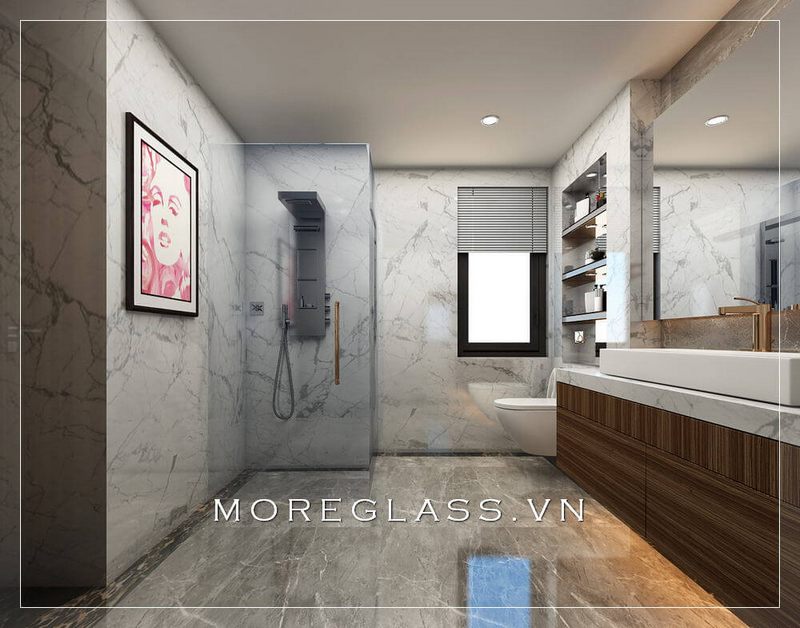 Sử dụng đá tự nhiên cao cấp, ốp nền và tường kết hợp với vách kính tắm cường lực, chúng tôi sẽ tạo ra một không gian hoàn hảo trong từng chi tiết cho mẫu thiết kế phòng tắm đẹp của bạn và phân cách hai không gian nhà vệ sinh và phòng tắm.