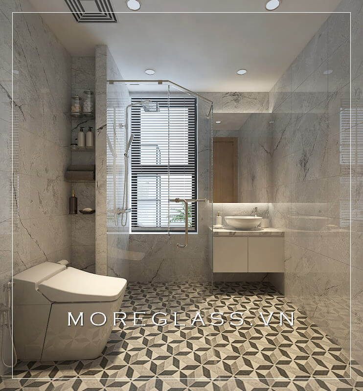 Mẫu thiết kế nhà vệ sinh hiện đại có phòng tắm kính cao cấp, cùng với thiết bị vệ sinh đơn giản và tiện nghi.