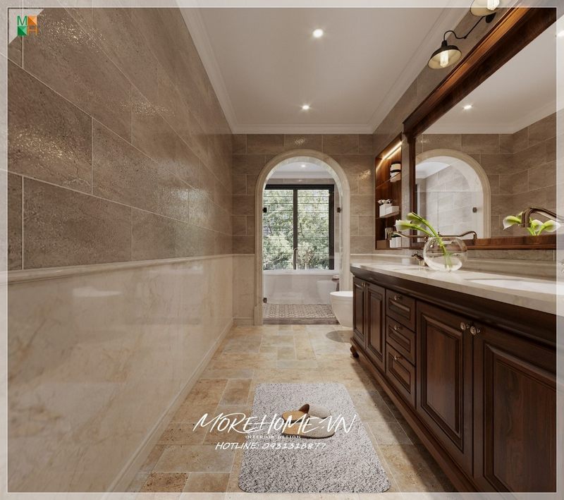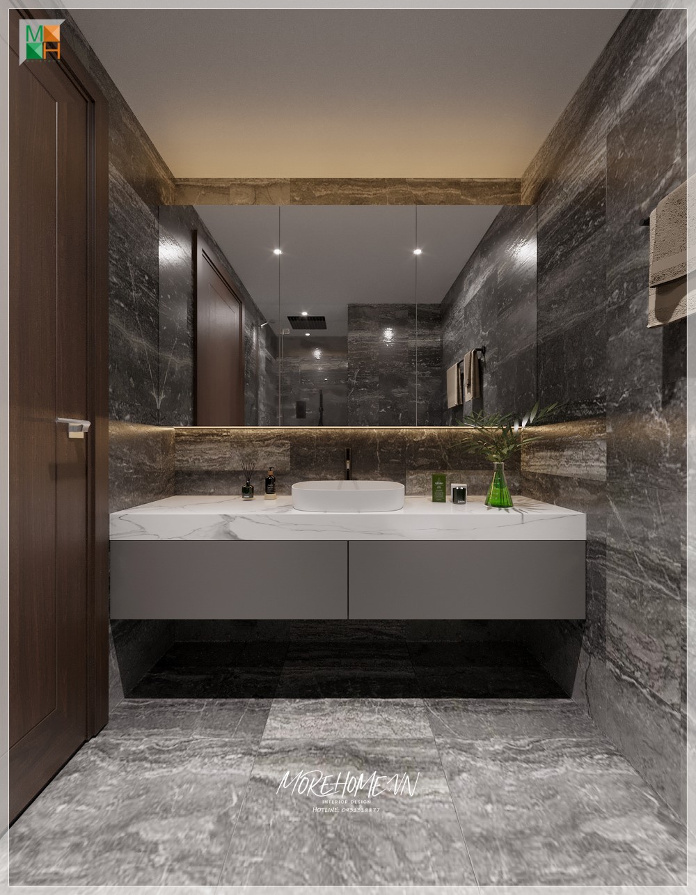 Kệ tủ lavabo treo tường mang lại diện tích không gian tối ưu với mặt đá gỗ công nghiệp màu nâu, giúp phòng tắm trở nên gọn gàng, ngăn nắp và có độ thẩm mỹ cao.