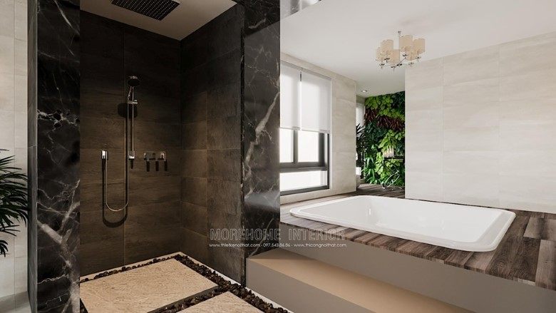 Đá ốp tường phòng tắm vân mây màu đen có độ bền cao, khả năng chống thấm, chống ố và tính thẩm mỹ cao.