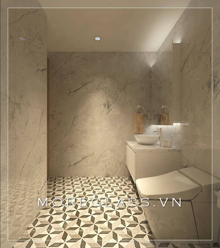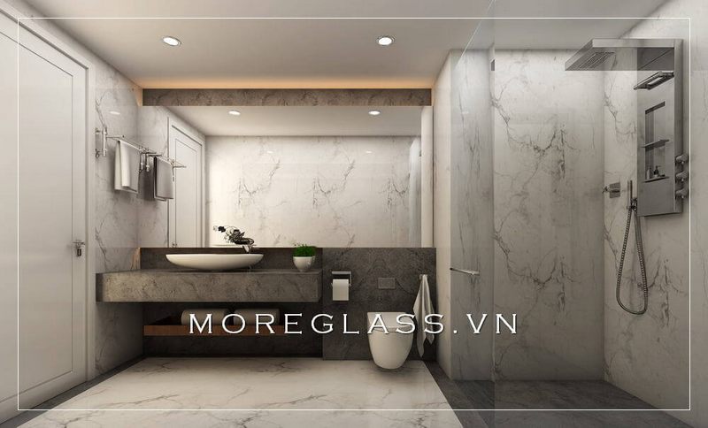 Mẫu đá ốp phòng tắm cao cấp màu trắng với đường vân loang màu xám góp phần tạo nên sự đặc biệt cho căn phòng.