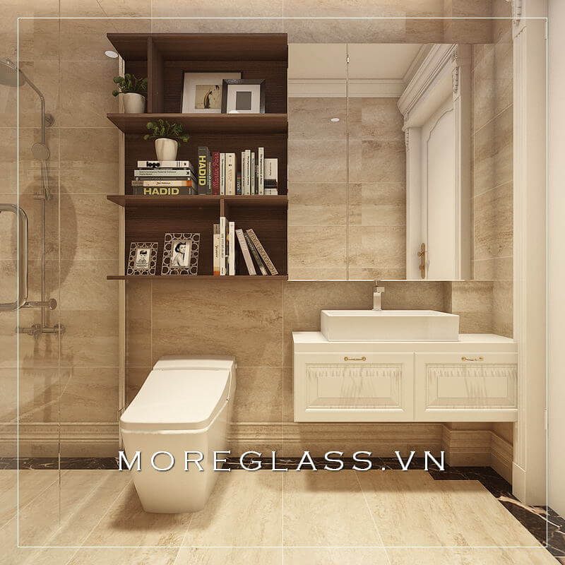 Phòng tắm hiện đại được thiết kế với các kệ tủ trang trí, tủ lavobo gỗ công nghiệp cao cấp và các thiết bị vệ sinh thông minh, giúp căn phòng tắm trở nên đầy đủ tiện nghi.