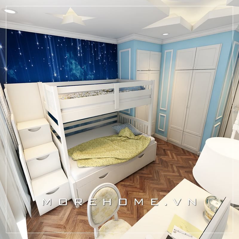 Mẫu giường ngủ gỗ tự nhiên phun sơn trắng tinh tế là lựa chọn hoàn hảo để trang trí phòng ngủ của 2 bé trai của bạn.