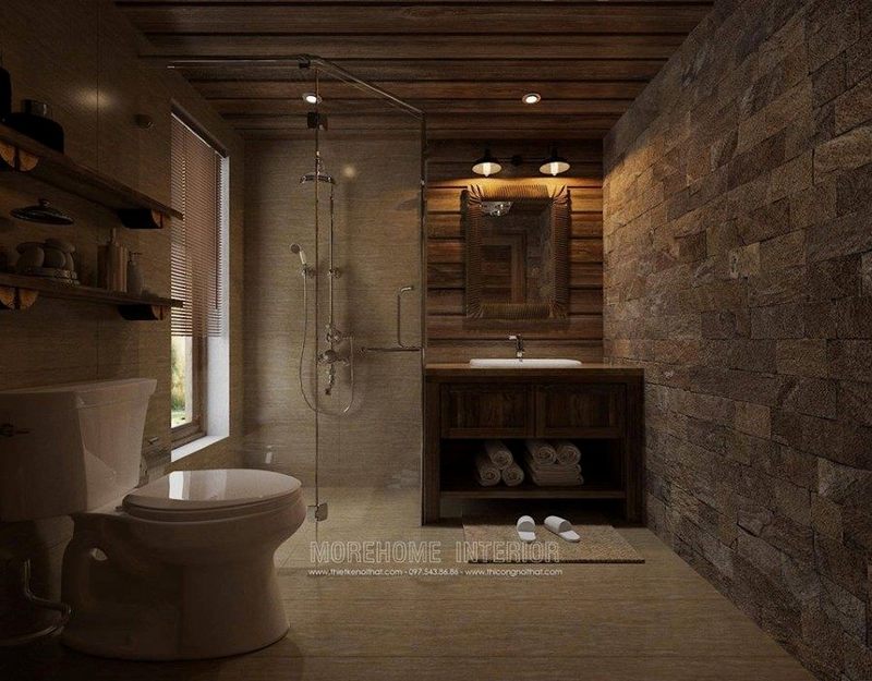 Phòng tắm được trang trí bằng gỗ cổ xưa với phong cách vintage đơn giản và màu sắc lãng mạng.